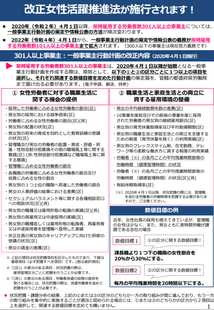 令和元年5月29日、女性活躍推進法等の一部を改正する法律が成立し、令和元年6月5日に公布されました。「一般事業主行動計画の策定義務の対象拡大」が令和4年(2022年)4月1日に施行されます。