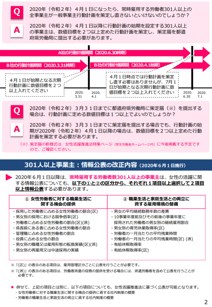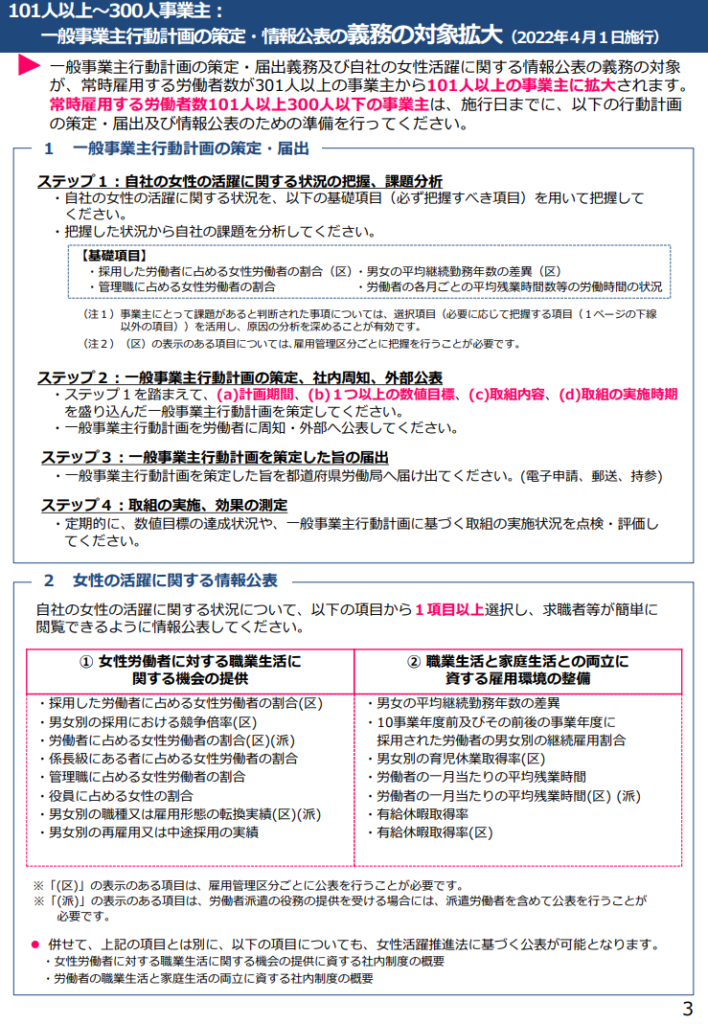 一般事業主行動計画の策定・届出義務及び自社の女性活躍に関する情報公表の義務の対象が、常時雇用する労働者が301人以上から101人以上の事業主に拡大されます。
