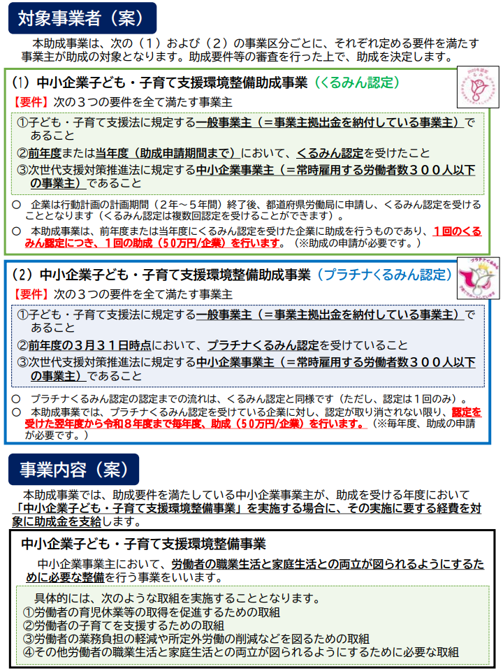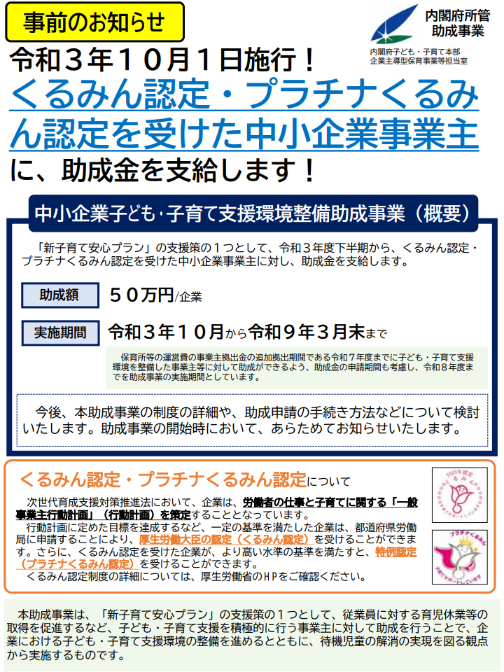 参照:令和3年10月1日施行 くるみん認定・プラチナくるみん認定を受けた中小企業事業主に、助成金を支給します
